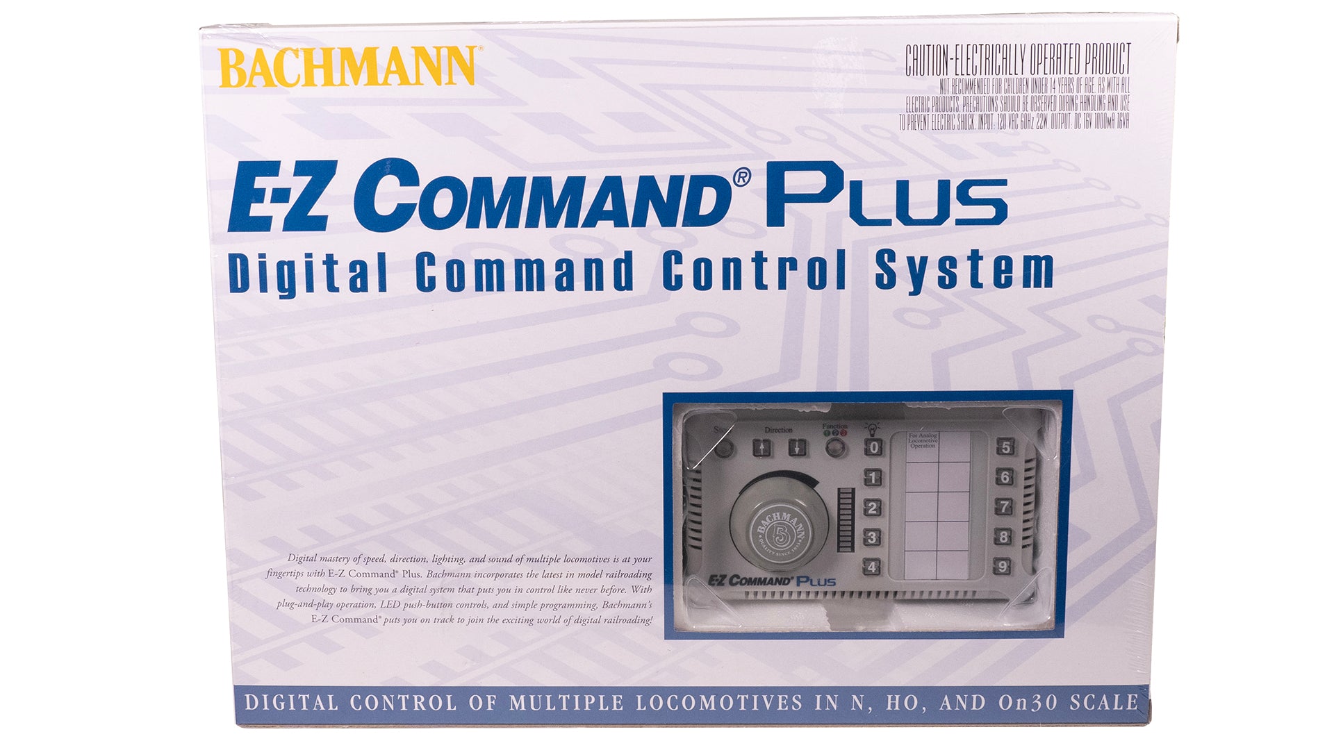 Bachmann Trains is pleased to announce the next generation of the E-Z Command® DCC Control System: E-Z Command® Plus. With E-Z Command®, digital control of speed, lighting, sound, and direction of multiple locomotives is at your fingertips, as well as remote control of Bachmann E-Z Command® DCC-equipped turnouts. E-Z Command® simplifies the programming process for locomotives with one-button, on-track programming and now features the ability to control up to 29 decoder functions per locomotive. Additional features of the E-Z Command® Plus system include 128-speed steps for smooth operation and plug-in wiring for simple setup, single-locomotive emergency stop in addition to full-track emergency stop, an LED lighted speed indicator, and new LED push-button controls. E-Z Command® will operate all DCC-equipped Bachmann locomotives as well as NMRA-compliant DCC locomotives from other manufacturers.